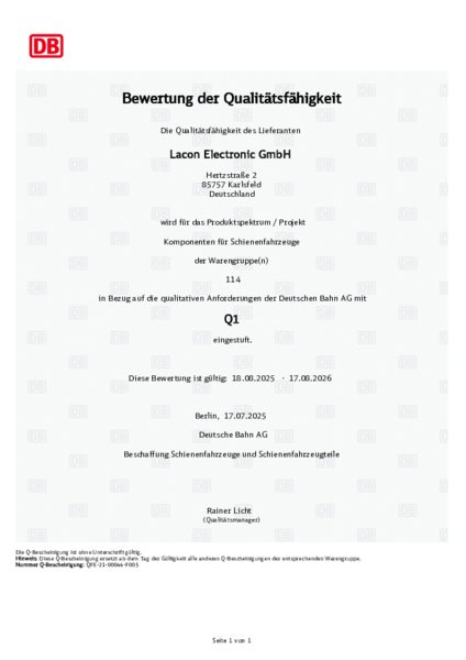 The result speaks for itself: Lacon was awarded Q1 status, the highest rating given by DB AG.